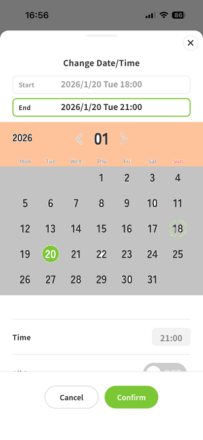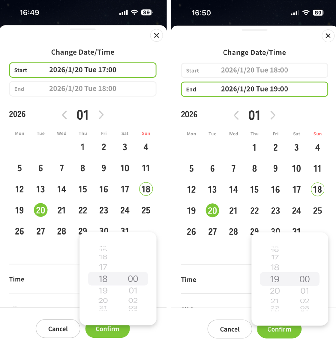 A screen to set the date and time will appear. Set the start time and end time respectively.