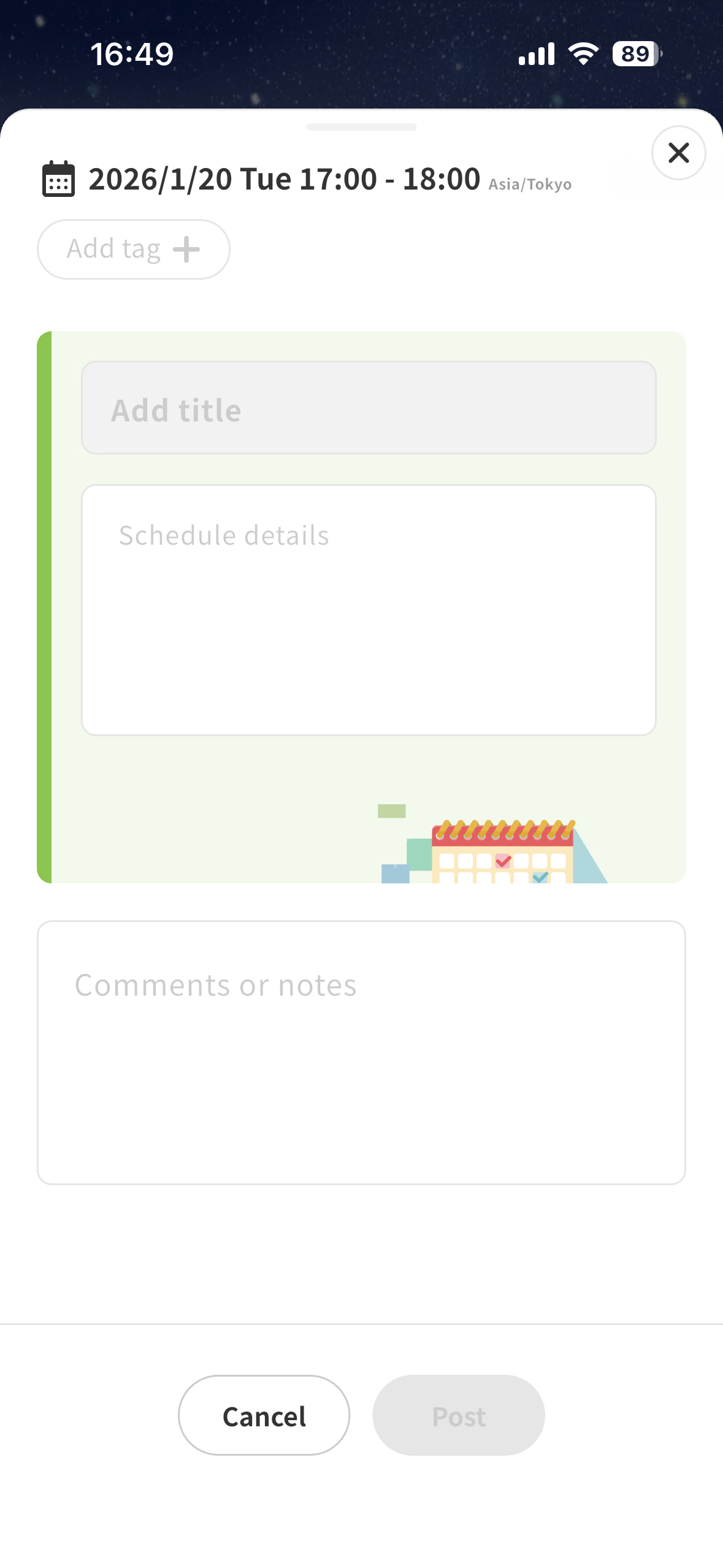 You can also optionally add details, comments, or tags to the schedule. Tapping the Post button at the bottom right will display the schedule on the timeline at the specified date and time.